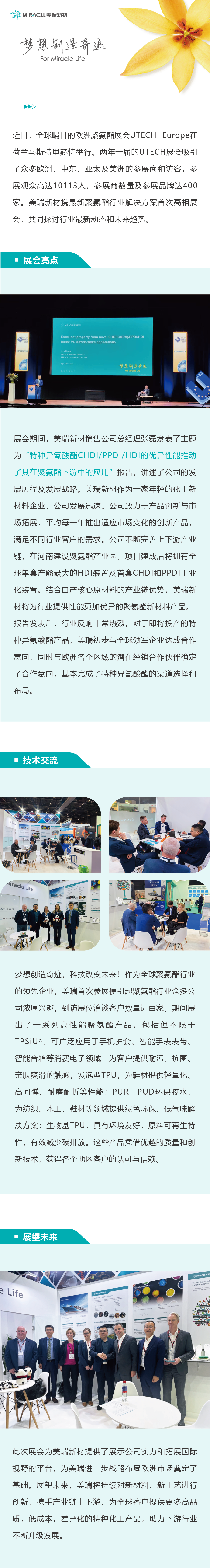 美瑞新材料股份有限公司(股票代码:300848),是国内知名的聚氨酯新材料(TPU、PUR、PUD、PBS)及功能化工品原料(特种异氰酸酯、特种胺)生产企业,产品广泛应用于消费电子、汽车制造、运动休闲、高端装备、绿色能源、家居生活、工业涂装、密封传动、3D打印、食品卫生等领域。